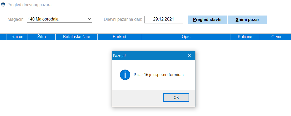 Ukoliko se prilikom izdavanja fiskalnih računa ne koristi modul SVera POS formiranje dnevnog pazara se radi iz stavke menija Maloprodaja – Računi – Formiranje Pazara. U zaglavlju se odabere šifra prodavnice za koju se formira Pazar i unosi se datum za koji se radi formiranje pazara. Nakon toga se klikne na dugme pregled stavki gde se može još jednom proveriti da li su sve transakcije obuhvaćene. Ukoliko aktiviran modul SVera POS a nakon klika da dugme Snimi sistem javlja poruku da se formiranje sme odraditi samo iz modula SVera POS. U suprotnom sistem javlja poruku da je Pazar uspešno formiran i korisnik može nastaviti sa procedurom za kraj dana.
