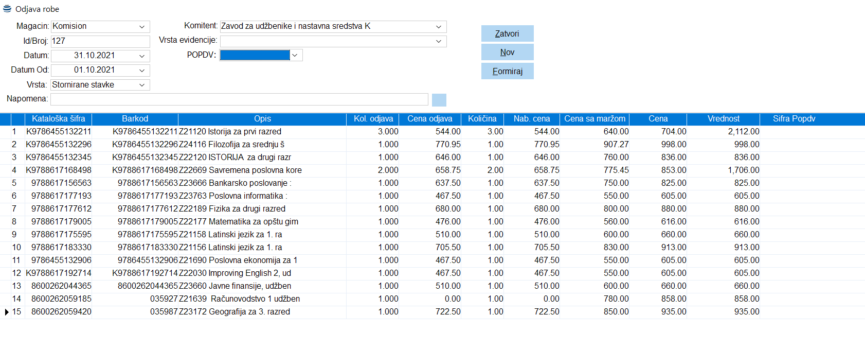Unos ovog dokumenta vrši se aktiviranjem stavke menija MP Komision – Odjava robe- Unos. U zaglavlju dokumenta u polju magacin odabrati vaš magacin komisione robe, a u polju Komisionar odabrati komitenta čiju robu odjavljujemo. Popunjavanjem komitenta softver vam u polju Datum od automatski popunjava prvi dan nakon datuma prethodne odjave. Polje Datum se automatski popunjavanja današnjim datumom, ali je njega moguće promeniti nekim ranijim datumom. Klikom na dugme Formiraj softver će vam popuniti prozor artiklima čiji je on komitent prodatim u definisanom periodu.