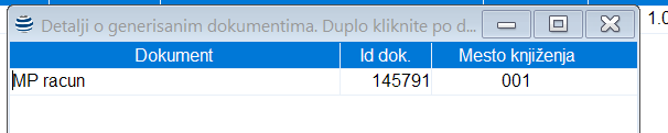 - Ako se nije desila greška prilikom generisanja dokumenta sistem prikazuje poruku o uspešnosti akcije i broju dokumenta koji je generisan