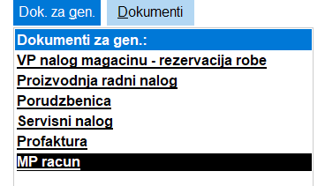 - Iz liste dokumenata koji mogu da se generišu izabrati opciju MP račun