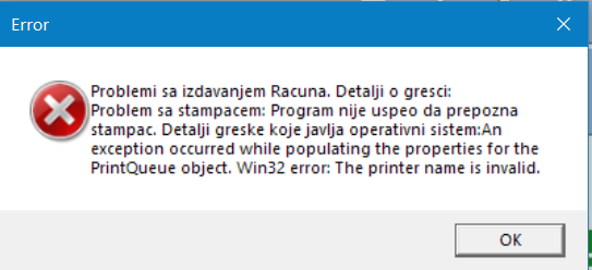 - Ako štampač koji je naveden u podešavanju nije instaliran dobija se poruka Problem sa štampačem Program nije uspeo da prepozna štampač