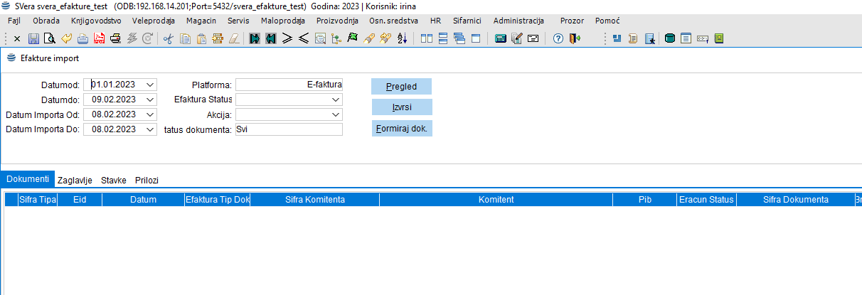 Biramo datume importa od i do (poželjno je da period ne bude predugačak jer sam SEF daje ograničenja u broju faktura koja možete preuzeti u određenom vremenu preporuka je do 7 do 30 dana zavisno od broja faktura za koje se očekuje import). Akcija - Iz padajuće lista izabrati Import dokumenata. Klik na dugme Izvrši.