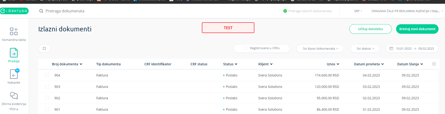 Na prvom primeru vidimo primere faktura koje su od strane dobavljača poslate na SEF. Ova slika je samo kao pokazni primer jer u integraciji su sve akcije pokrivene tako da nemate potrebe da bilo koju akciju radite na samom SEF-u već možemo sve akcije da izvršimo iz same Svere.
