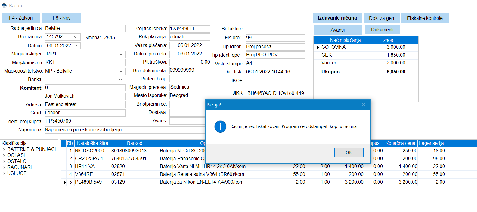 Pregled izdatih kopija za račun. U okviru liste MP računa, duplim klikom na podatak u polju JIKR za željeni MP račun, pojavljuje se maska sa pregledom izdatih kopija tog MP računa. U datim primeru vidimo da je za račun sa internim brojem 145792 izdata jedna kopija računa. Ukoliko se iz nekog razloga izdalo više kopija računa svaka će biti prikazana na ovaj listi. Takođe na ovoj listi se mogu videti sve izdate kopije za sve račune uklanjanjem filtera pretrage.