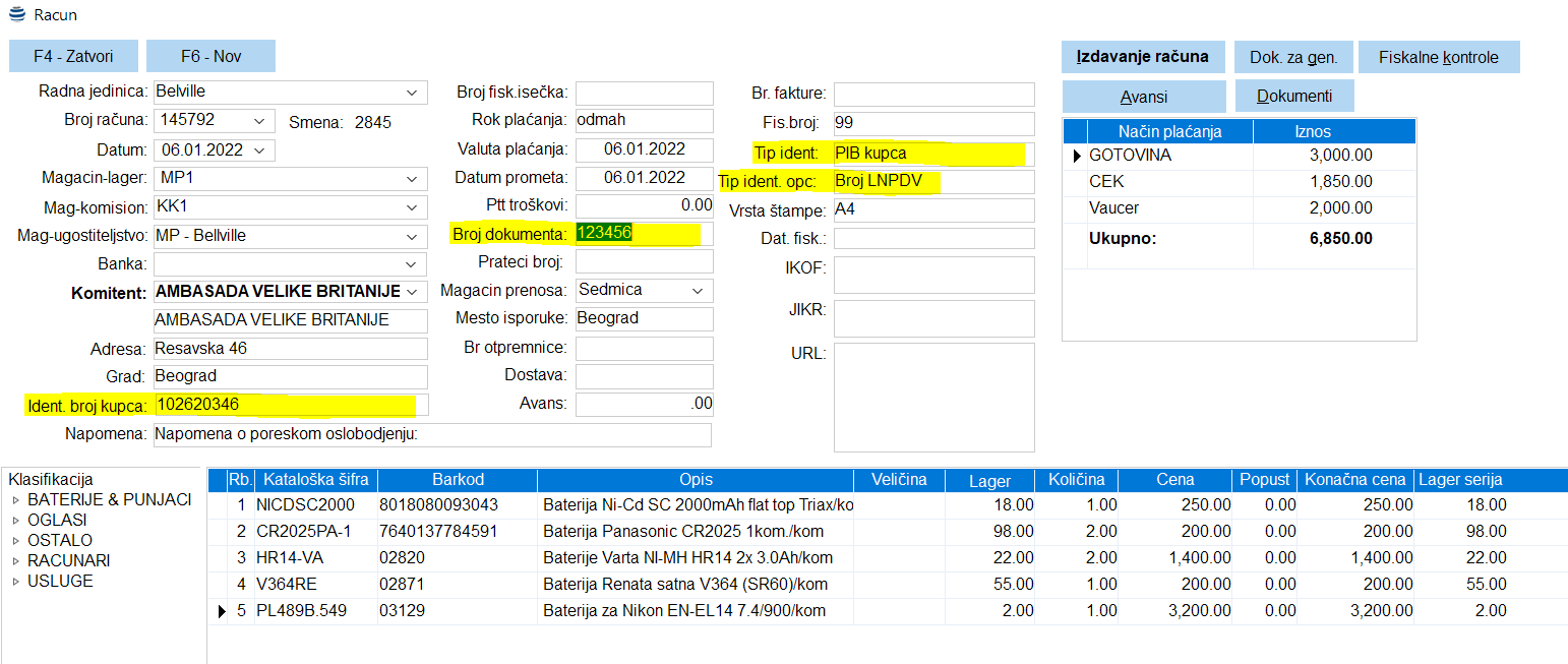 Ukoliko imamo situaciju da treba uneti i dodatne podatke o transakciji npr. prodaja ambasadi onda u zaglavlju moraju da se popune još dva polja i to tip identifikacije opciono i polje broj dokumenta. Prvi podatak se bira iz šifarnika opcija a drugi predstavlja broj dokumenta koji kupac prilaže da bi dokazao status npr. kod ambasada bi to bilo broj LNPDV. Svakako su moguće i druge situacije zavisno od tipa kupca koji prometuje dobra i usluge na prodajnom mestu. Oblici štampe za Journal i A4 format za ovu vrstu dokumenta su definisani u dodatku ovog dokumenta u poglavlju Specifikacija štampi.