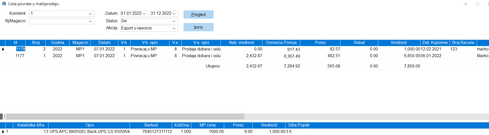 Lista svih kreiranih refundacija dobija se aktiviranjem stavke menija Maloprodaja – Povraćaj od kupca – Listanje i klikom na dugme Pregled. Izborom statusa u zaglavlju pregleda, možemo da pregledamo neproknjižene ili proknjižene refundacije u knjigovodstvenom smislu. Predefinisan status je Svi, što daje listu svih kreiranih refundacija. U samoj listi refundacija moguće je pretraživati dokumente po kolonama koje sastavni deo fiskalnih dokumenata (vreme fiskalizacije, PFR broj, Broj fiskalnog isečka itd..). Takođe duplim klikom na kolonu JIKR je moguće videti da li bilo štampu kopija za izabranu refundaciju.