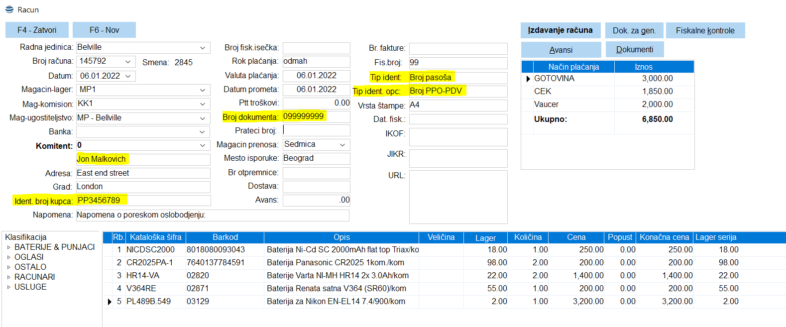Ovo je podvrsta prethodne situacije ali je izdvajamo jer je relativno česta situacija. Polja u zaglavlju se popunjavaju na potpuno isti način kao i u prethodnoj situaciji samo se biraju druge vrednosti za tipove identifikacije. Oblici štampe za Journal i A4 format za ovu vrstu dokumenta su definisani u dodatku ovog dokumenta u poglavlju Specifikacija štampi.