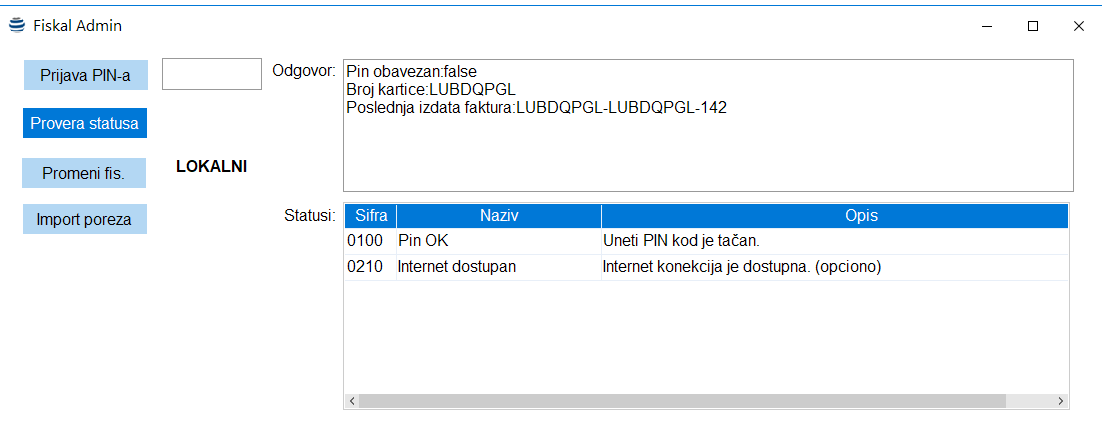 Klikom da dugme Provera Statusa sistem vraća trenutni status PFR-a i kroz niz poruka prikazuje koji je status. Na ovaj način korisnik može da ustanovi ako postoji problem koji element u sistemu izaziva taj problem (nije unet pin, čitač nije povezan, PFR nije dostupan, kartica nije u čitači itd.) i na taj način lakše da otkloni problem.