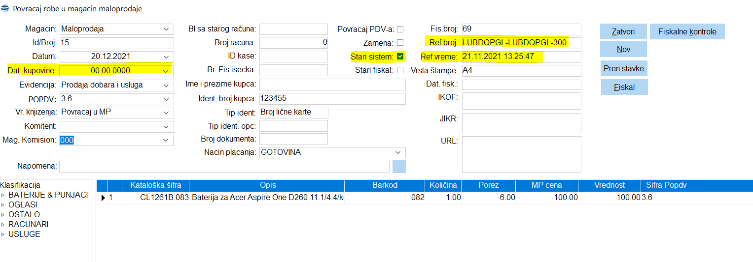 Ovo je situacija npr. kada kupac refundira račun koji je izdat po novom sistemu fiskalizacije ali podaci o tom računi nisu dostupni u bazi podataka radi automatske obrade. U tom slučaju korisnik mora ručno da popuni polja ref broj i ref vreme sa podacima koje vide na štampanom obliku računa. Takođe u ovoj situaciji se čekira stari sistem da bi se omogućilo korisniku da unese stavke koje se reklamiraju ali se stari fiskal NE čekira da bi sistem prosledio ispravan referentni broj i vreme u PFR jer u ovom slučaju dostupni su referentni podaci sa originalnog računa po novom sistemu fiskalizacije.