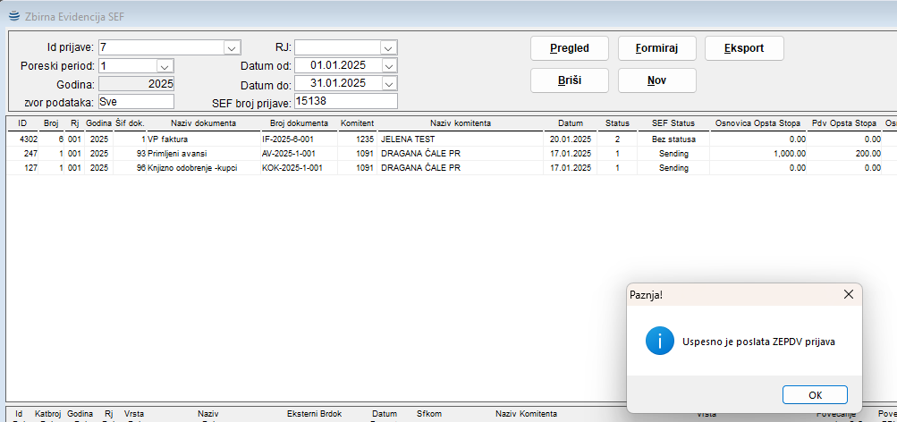 Poslednji korak jeste slanje ZEPDV. To radimo na dugme Eksport, kada dobijemo poruku da je Uspesno poslata ZEPDV prijava u zaglavlju ZEPDV-a u polju SEF broj prijave , dobicete broj ZEPDV prijave koji ste poslali na SEF-u.