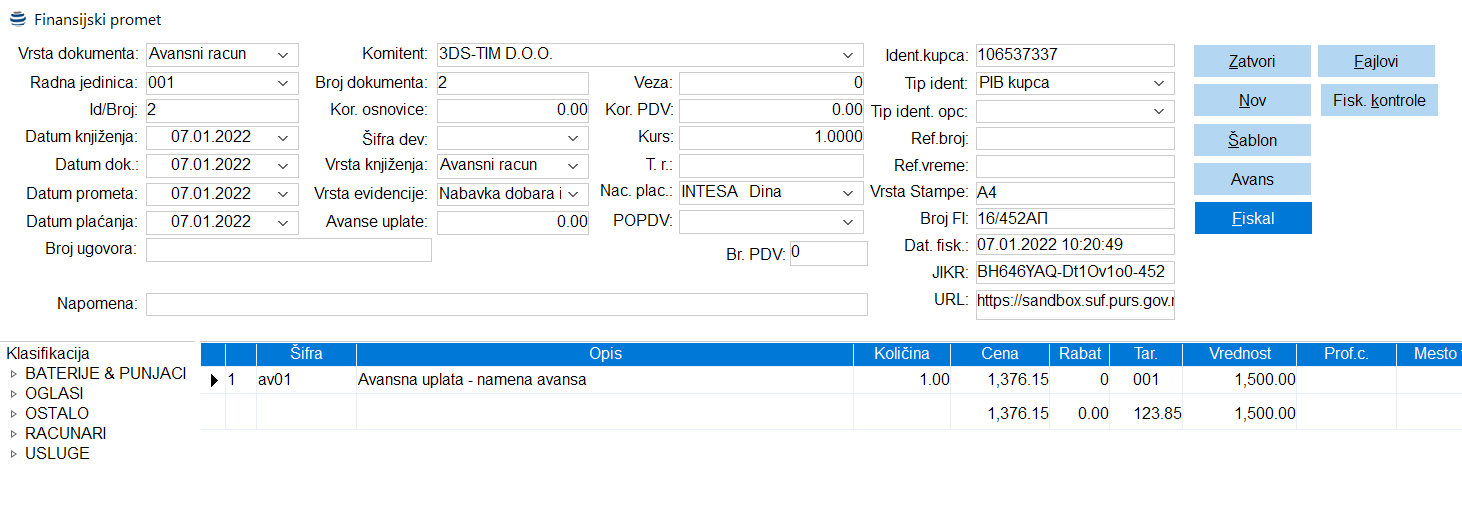 Primer izdavanja avansnog računa sa uplatom od prethodnog dana gde primećujemo da je datum fiskalizacije različiti od datuma primanja uplate. Prilikom štampe računa u ovom slučaju u polju ESIR datum će se prikazati datum uplate avansa kao što je propisano od strane poreske uprave.