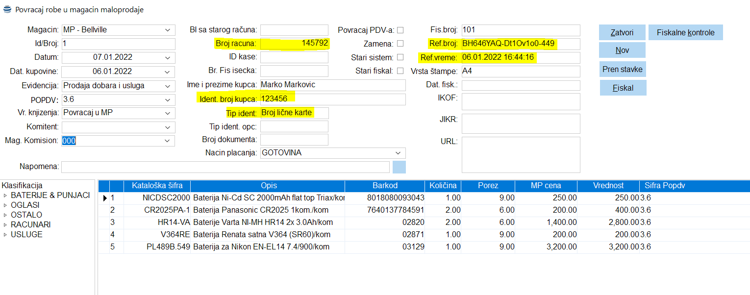 Nakon popunjavanja stavki moguće je fiskalizovati refundaciju. Na narednoj slici vidimo najstandardniju situaciju kada imamo refundaciju od fizičkog lica gde smo uneli broj lične karte i podaci o referentnom računu se nalaze bazi podataka.