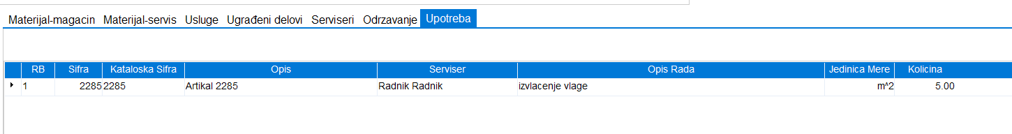 U ovom tabu definišemo upotrebu alata i mašina koji su u šifarniku artikala označeni kao vrsta artikla osnovno sredstvo ili sitan inventar. Ideja je da se prati koliko je koji radnik koristio određeno sredstvo prilikom realizacije radnog naloga.