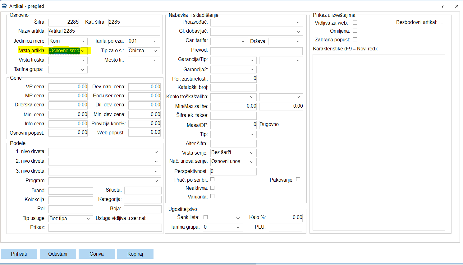 Šifra – Bira se šifra iz padajuće listi artikala. Može se izabrati samo šifra koja pripada koja je označena kao Osnovno sredstvo ili sitan inventar
