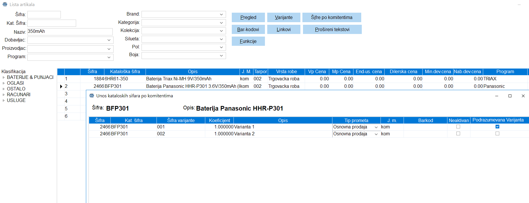 Varijante predstavljaju način na koji se artikal može prodati. Ova funkcionalnost se često koristi kod paketnih prodaja kada (nor paketi mobilnih operatora kada jedan artikal ima drugačiju cenu zavisno od paketa u kome se prodaje) ili kada ukazujemo na neki atribut artikla pa je neophodno zbog analize prodaje da se taj atribut naglasi (npr. boja artikla). Varjante se unose tako što se za odabrani artikal klikne na dugme Varijante nakon čega se otvara prozor u koje je moguće uneti sve varijante koje će važiti za odabrani artikal.