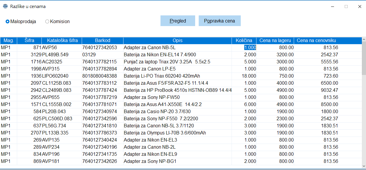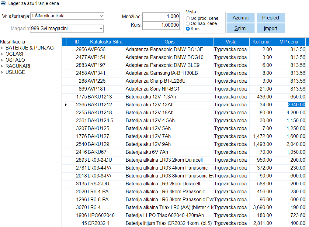 Ručni unos cenovnika se radi aktiviranje odgovarajuće stavke menija prilikom koje se otvara sledeći prozor. U ovoj tabeli je moguće ažurirati jednu ili više cena.