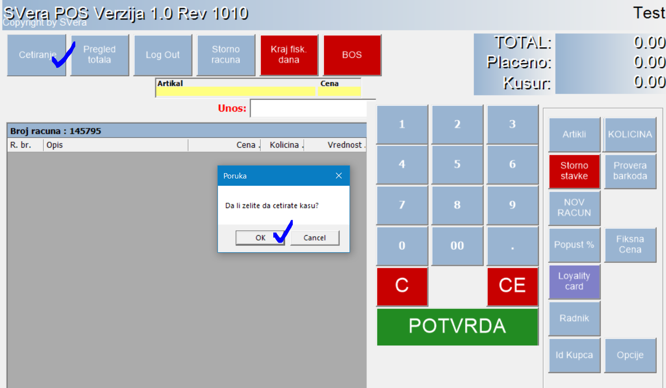 Sam izraz „cetiranje“ znači pražnjenje. U našem slučaju to je pražnjenje kase. Ova opcija se najčešće primenjuje kod primopredaje smene. Pritiskom na dugme Cetiranje (ili F11 na tastaturi) otvara se prozor gde treba kliknuti OK ili pritisnuti Enter. Ovo prouzrokuje štampanje specifikacije prodaje i specifikacije uplata, i otvara se prozor za prijavu korisnika. Nakon cetiranja pregled totala je resetovan, odnosno vraćen na nulu. Sam izveštaj o cetiranju se može videti kroz backoffice modul u poglavlju Izveštaji – Finansijski izveštaji - Cetiranje kase.