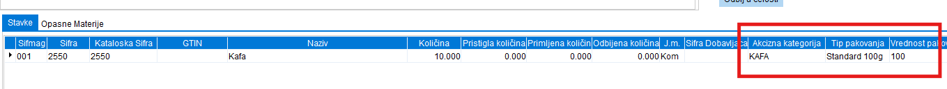Na ovaj način se prilikom odabira artikala, kako na profakturi, fakturi, nalogu rezervacije, izlaz robe (generisanjem eOtpremnice iz navedenih dokumenata) pa i pri ručnom kreiranju eOtpremnice odnosno unosom artikala ova navedena polja automatski popunjavaju.