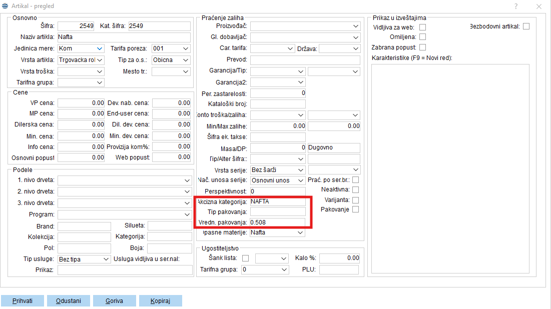 Potrebno je da se na karticama artiklima, koji spadaju u akciznu robu, obavezno unesu stavke koje se odnose na Akcizna kategorija i Vrednost pakovanja dok Tip pakovanja nije obavezan.