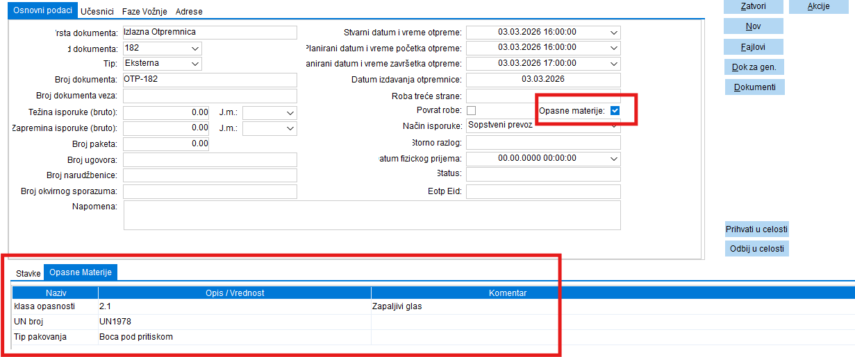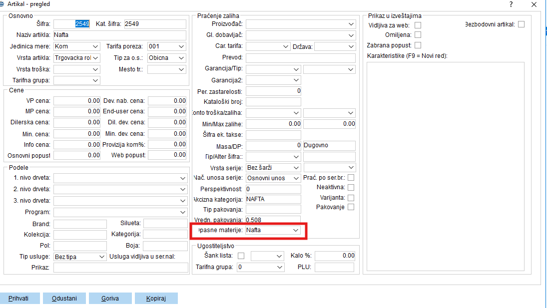 - Identifikacija opasnih materija: Neophodno je označiti polje koje definiše artikal kao opasnu materiju. Ova radnja se izvršava automatski prilikom odabira artikla, pod uslovom da je polje „Opasne materije“ prethodno definisano u šifarniku artikala. Ukoliko nije štiklirati ručno.