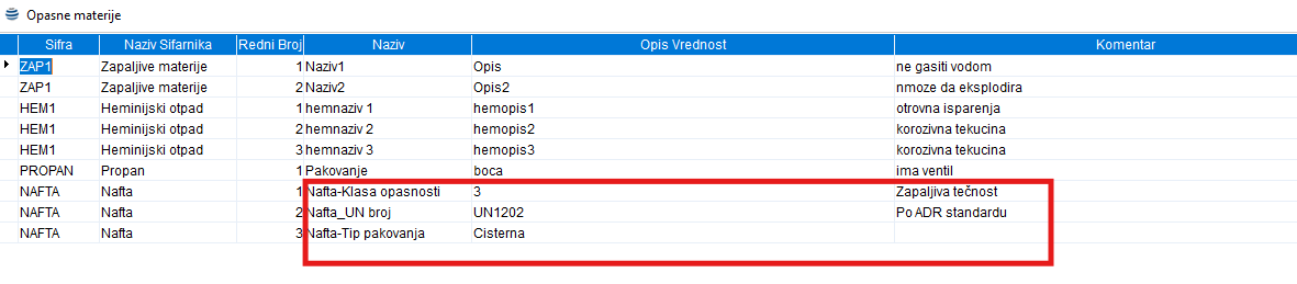- Višeredni ispis podataka: Ukoliko je na eOtpremnici potreban prikaz više redova podataka, u šifarniku Opasnih materija je potrebno uneti odgovarajući broj redova sa identičnom šifrom i nazivom, ali sa različitim rednim brojevima. Kolone Naziv, Opis/Vrednost i Komentar popunjavaju se u skladu sa tehničkim zahtevima.