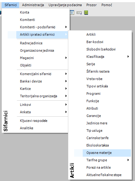 - Evidencija akcizne robe: Ukoliko opasne materije podležu akciznom režimu, vrši se unos akcizne kategorije i vrednosti pakovanja. Ovi podaci se unose u okviru obrasca „Stavke“ (automatski se generišu ukoliko su parametri podešeni na kartici artikla).