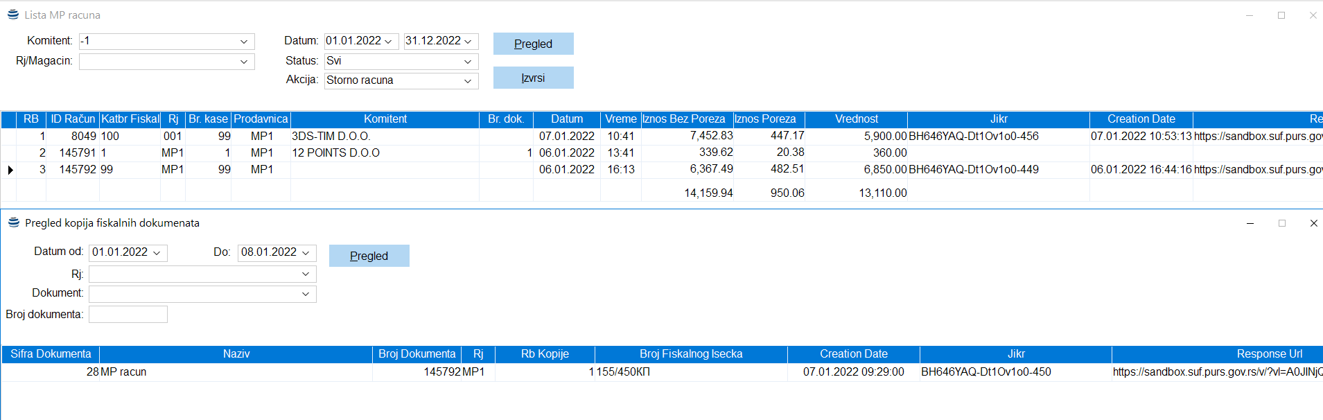 Pregled izdatih kopija za račun. U okviru liste MP računa, duplim klikom na podatak u polju JIKR za željeni MP račun, pojavljuje se maska sa pregledom izdatih kopija tog MP računa. U datim primeru vidimo da je za račun sa internim brojem 145792 izdata jedna kopija računa. Ukoliko se iz nekog razloga izdalo više kopija računa svaka će biti prikazana na ovaj listi. Takođe na ovoj listi se mogu videti sve izdate kopije za sve račune uklanjanjem filtera pretrage.