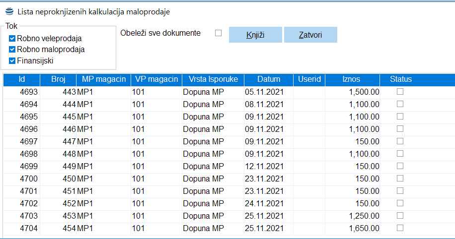 Knjiženje kalkulacija se može odraditi na dva načina jedan je nakon unosa dokumenta gde se u meniju sa alatkama izabere opcija Knjiži ili se u slučaju grupnog knjiženja više MP kalkulacija knjiženje vrši preko stavke menija Maloprodaja – Kalkulacija - Knjiženje