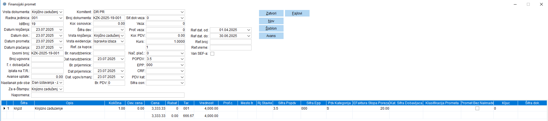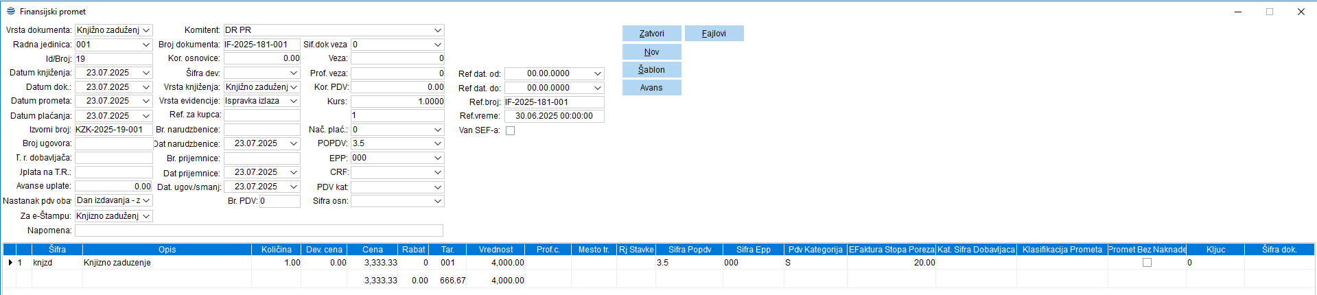 - Ref dat. od/Ref dat. do – ako se knj. zaduženje odnosi na fakture u periodu, popuniti oba polja. Polja Ref broj i ref vreme u tom slučaju ostaviti praznim.