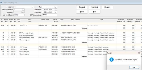 Sacekajte poruku da je Uspesno formirana ZEPDV prijava, potom klik na dugme Exsport, korigovaćete odabranu ZEPDV prijavu za odredjeni period. Dobicete poruku da je uspešno formirana ZEPDV prijava, primeticete da je SEF broj prijave u zaglavlju drugačiji, što znaci da svaki put kada korigujete ZEPDV promenice se i SEF broj prijave.