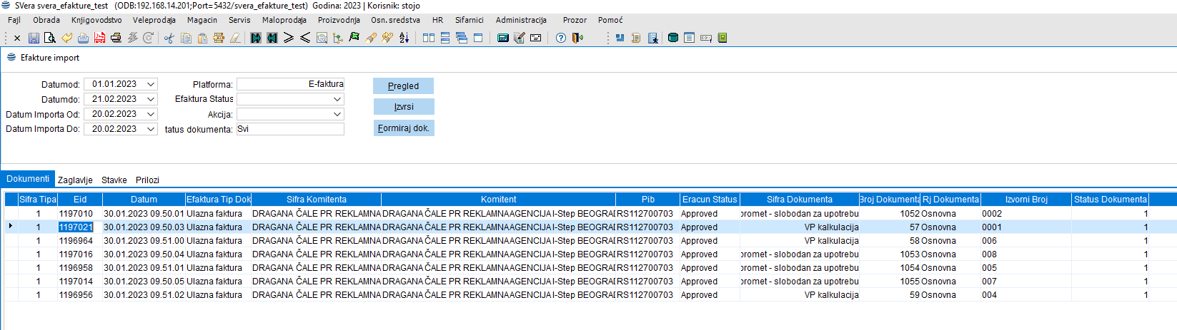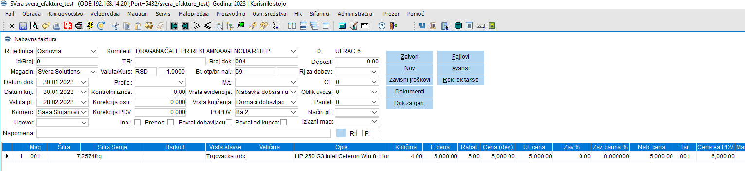 Obavezno proveriti i korigovati: Vrstu evidencije, dok u stavkama dokumenta upisujete umesto šifre import efaktura u kolonu šifra odgovarajući šifru artikla koja odgovara toj poziciji ukoliko Svera nije prepoznala na osnovu šifre dobavljča tu poziciju u suprotonom samo provera da li za taj dokument je predložena analitika odgovarajuća.