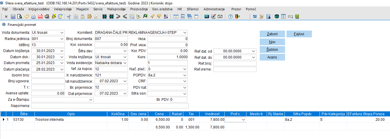 Obavezno proveriti i korigovati: Vrstu evidencije u zaglavlju dokumenta, dok u stavkama dokumenta upisujete umesto šifre efak u kolonu šifra odgovarajući analitiku koja odgovara toj poziciji ukoliko Svera nije prepoznala na osnovu šifre dobavljča tu poziciju u suprotonom samo provera da li za taj dokument je predložena analitika odgovarajuća. Takođe u stavkama ukoliko program nije prepoznao analitiku popunjavate POPDV poziciju i Tarifu poreza. Takođe ukoliko je dobavljča naveo tekuće račune na koje želi da mu se izvrši uplata taj podatak će se upistai u polje T.r i sa knjiženje preneti u analitiku dobavljača. Na osnovu ovog podatke prilikom kreiranja el. naloga za plaćanje program će dati prednost ovom podatku tj tekućem računu koji smo dobili importom sa SEF-a