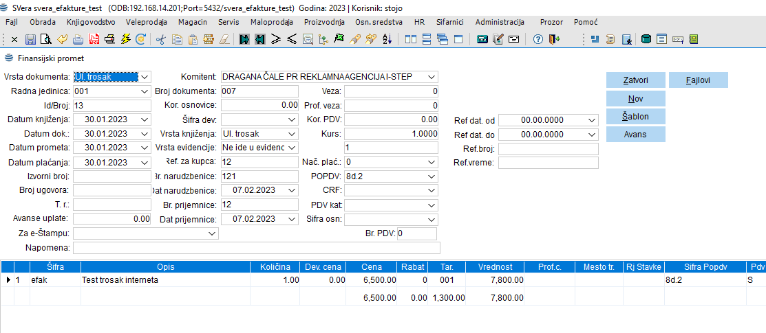 Kada otvorimo listu dokumenata u finansijskom prometu pojavljuje se novo generisani dokument. Do ovog dokumenta možemo doći i duplim klikom na polje broj dokumenta iz taba Dokumenta tj nije neophodno da pokrećemo listu finansijskih prometa.