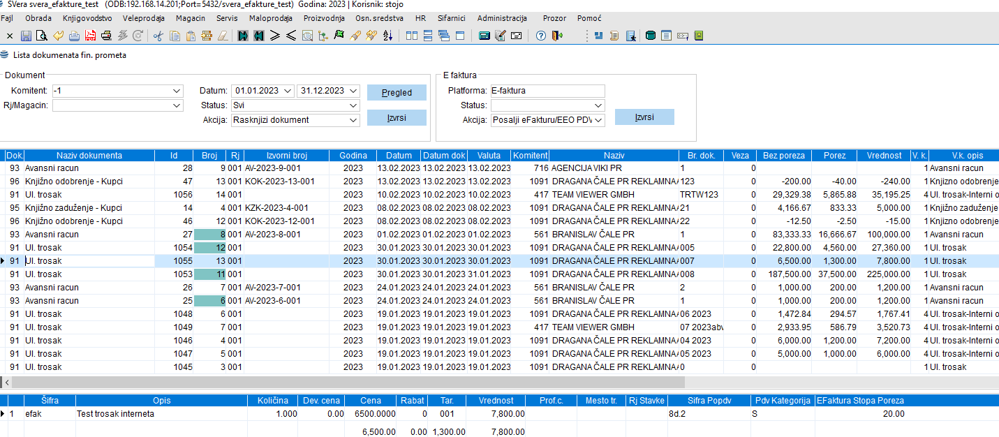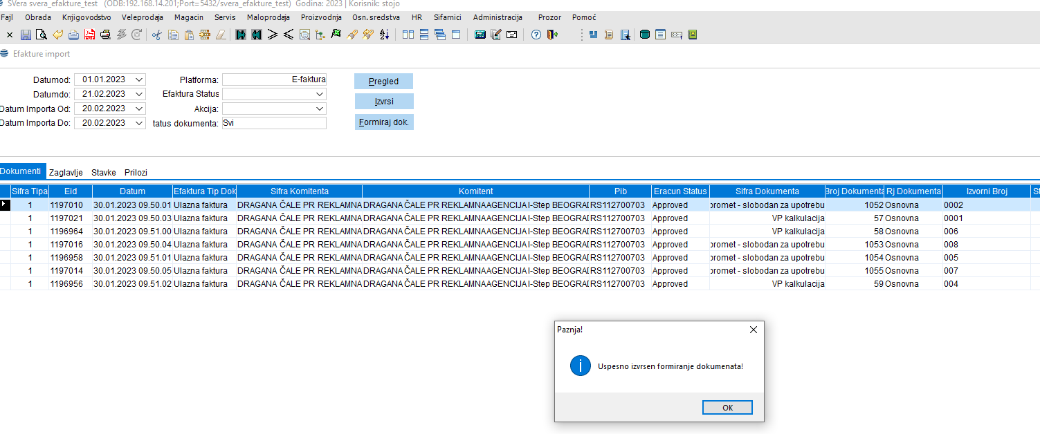 Nakon provere primljenog racuna, obeležiti red / račun sa ctrl klik na početak reda (zaplavi se red) Kliknuti na dugme formiraj dokument. Tada se podaci iz liste prenose u odgovarajući dokument …Finansijski promet ili Nabavnu fakturu i u odgovarajućim poljima u tabu Dokumenti se popunjavaju polja broj dokumenta i Rj dokumenta.