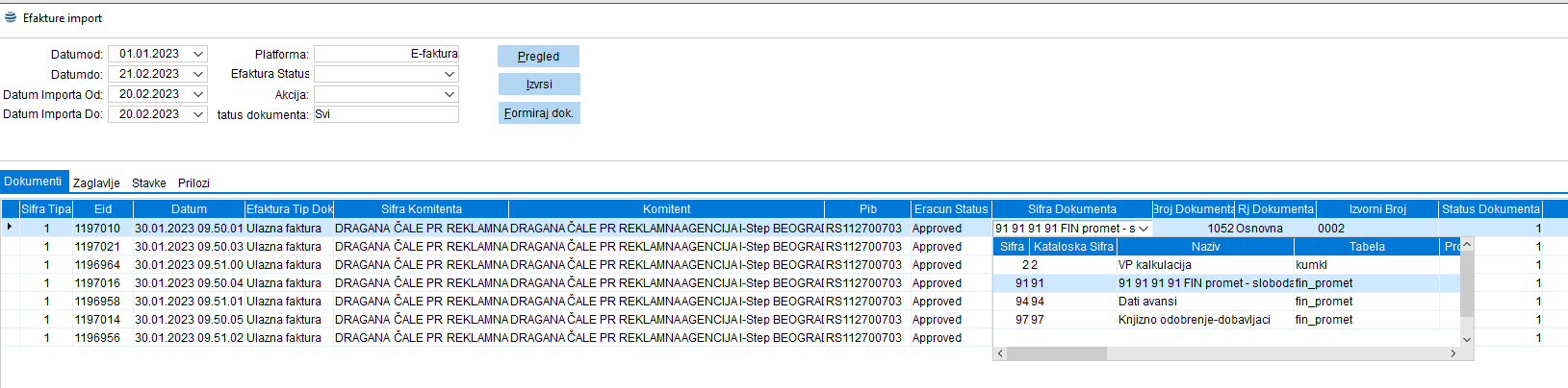 Pre nego što se iz pregleda prenesu importovani e-racuni u odgovarajući dokument, iz padajuće liste treba izabrati odgovarajući dokument u koloni šifra dokumenta odgovarajući dokument u sveri za dalju obradu importovanih Računa. Šifra dokumenta predstavlja dokument koji želimo da formiramo. Program će preporučiti šifru dokumenta na osnovu poslednje kreiranog dokumenta. Svakako vrsta dokumenta se može promeniti od strane korisnika. Polja status i broj dokumenta su popunjena za dokumenta koja su već kreirana u Sveri i za njih nije moguće ponovo formirati dokument.