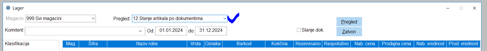 Za potrebe nezavisno magacinskog poslavanja korisnici iz role magacioner koriste u lager listi izveštaj pod opcijom 12. Ovaj izveštaj daje virtuelno stanje magacina na osnovu unetih i potvrđenih dokumenata. Ostali izveštaji iz lagr liste prate stanje robno proknjiženih dokumenata. Ukoliko se promene datumi u poljima od i do program će prikazati magacinsko stanje po dokumentima sa datumima koji pripadaju izabranom periodu.