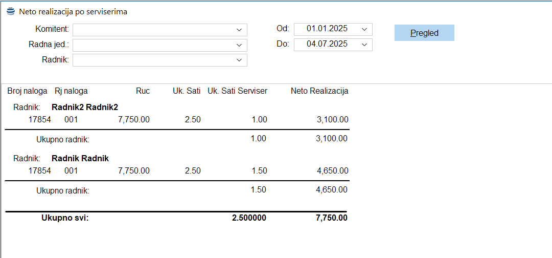 Ukoliko želimo da pratimo ovaj izveštaj preduslov je da se definišu nabavne cene za rad servisera u šifarniku poslova. Na taj način ovaj izveštaj može dati podatke o tome koliko je svaki serviser (radnik) u određenom periodu zapravo zaradio za firmu tj koliko je ostavio neto realizaciju u smisli ostavarene razlike u ceni rada.
