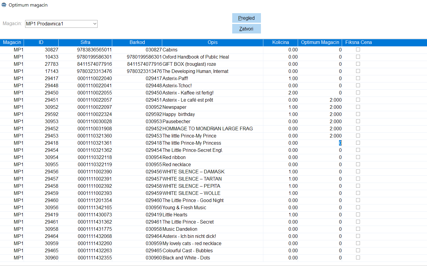 U kolonu Optimum Magacin unesite optimalne količine za željene artikle, kao na slici ispod.