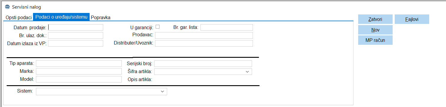Sistem – Unosi se šifra sistema koji se održava (popravlja) iz šifarnika Sistema. Ovo polje je obavezno ukoliko se servisni nalozi odnose na sisteme.
