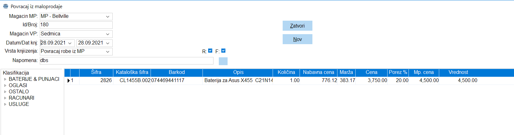 Stavka menija: Maloprodaja – Povracaj – Unos