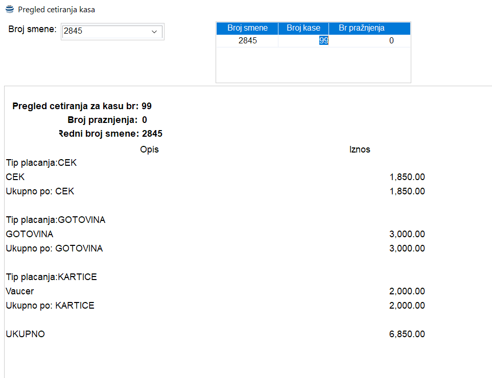Ovaj izveštaj služi da se iz backoffice modula u svakom trenutku prati finansijsko stanje svih kasa u objektu (aktiviran SVera POS modula). Izveštaj se aktivira preko stavke menija Maloprodaja – Izveštaji – Finansijski Izveštaji – Cetiranje. U zaglavlju izveštaja se bira redni broj smene na osnovu datuma kojeg proveravamo i biramo broj pražnjenja u toku dana (koja je smena zapravo u pitanju). Nakon toga program prikazuje finansijske podatke sa odgovarajuće kase tj. specifikaciju naplaćenih računa po tipovima i vrstama plaćanja.