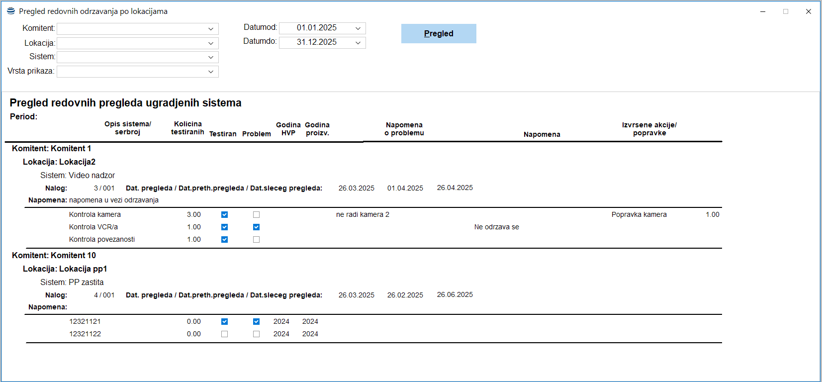Osnovna upustvaServisServis izveštaji Pregled redovnih održavanja po lokacijama Ovaj izveštaj daje kompletan pregled svih aktivnosti nad sistema tj sve aktivnosti koje su po evidentiranim radnim nalozima odrađene na lokaciji klijenta nad datim sistemom.