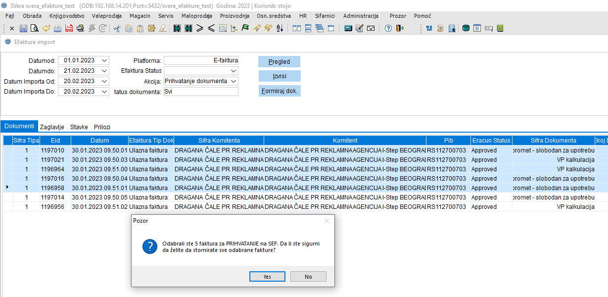 Ctrl + klik na redove obeležiti dokumenta koja želimo prihvatiti. U zaglavlju Akcija- izabrati iz padajuće liste Prihvatanje dokumenta i klikom na Izvrsi potvrđujemo izabrana dokumenta – Odgovoriti na pop-up sa YES i nov status se prenosi na SEF automatski. Isti je je postupak samo uz drugu izabranu akciju ako želimo da odbijemo dokument.