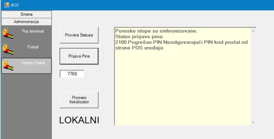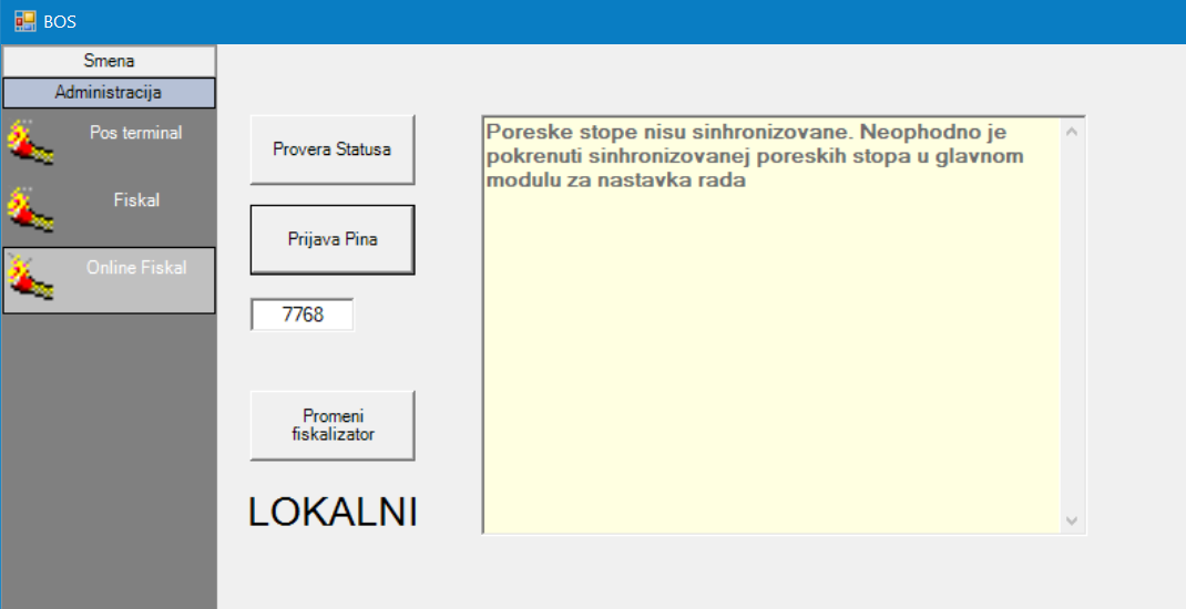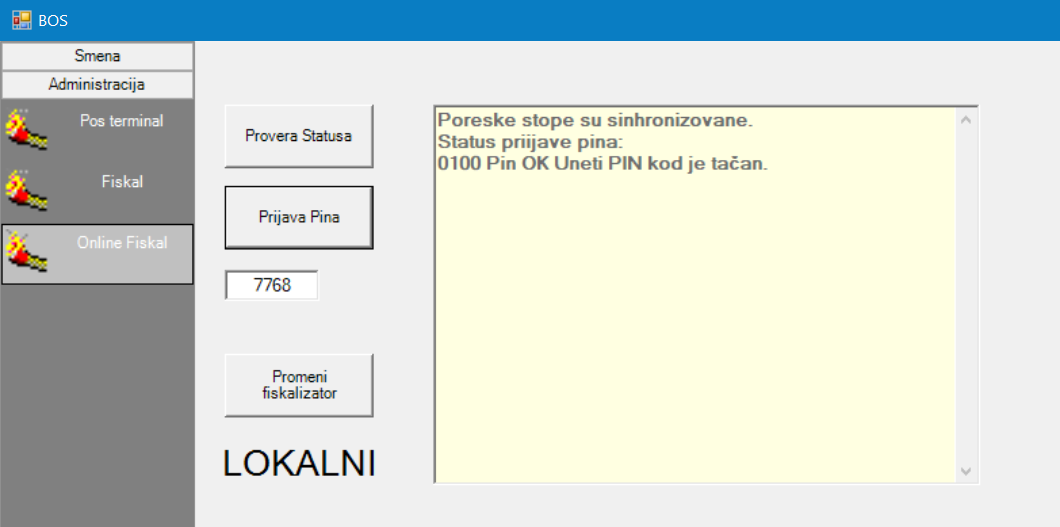 Ukoliko podešen sistem da radi preko LPFR-a što je standardna konfiguracija pre izdavanja fiskalnih računa neophodno je da se softver i LPFR poveži između sebe tako što će se korisnik identifikovati preko svog pina. U polje pored dugmeta Prijava PIN-a se unosi PIN za karticu koja se nalazi u čitaču koje je povezan za taj računar i klikne se dugme Prijava PIN-a. Ako je sve u redu dobijamo sledeću poruku i na taj način smo uspostavili vezu između LPFR-a i softvera i možemo da izdajemo fiskalne račune. Prilikom projave PIN-a softver proverava da li su poreske stope ažurirane i ako nisu ne dozvoljava prijavu već korisnika porukom obaveštava da je neophodno da se ažuriranje odradi u Backoffice modulu (pogledati poglavlje Prozor fiskalne kontrole backoffice).