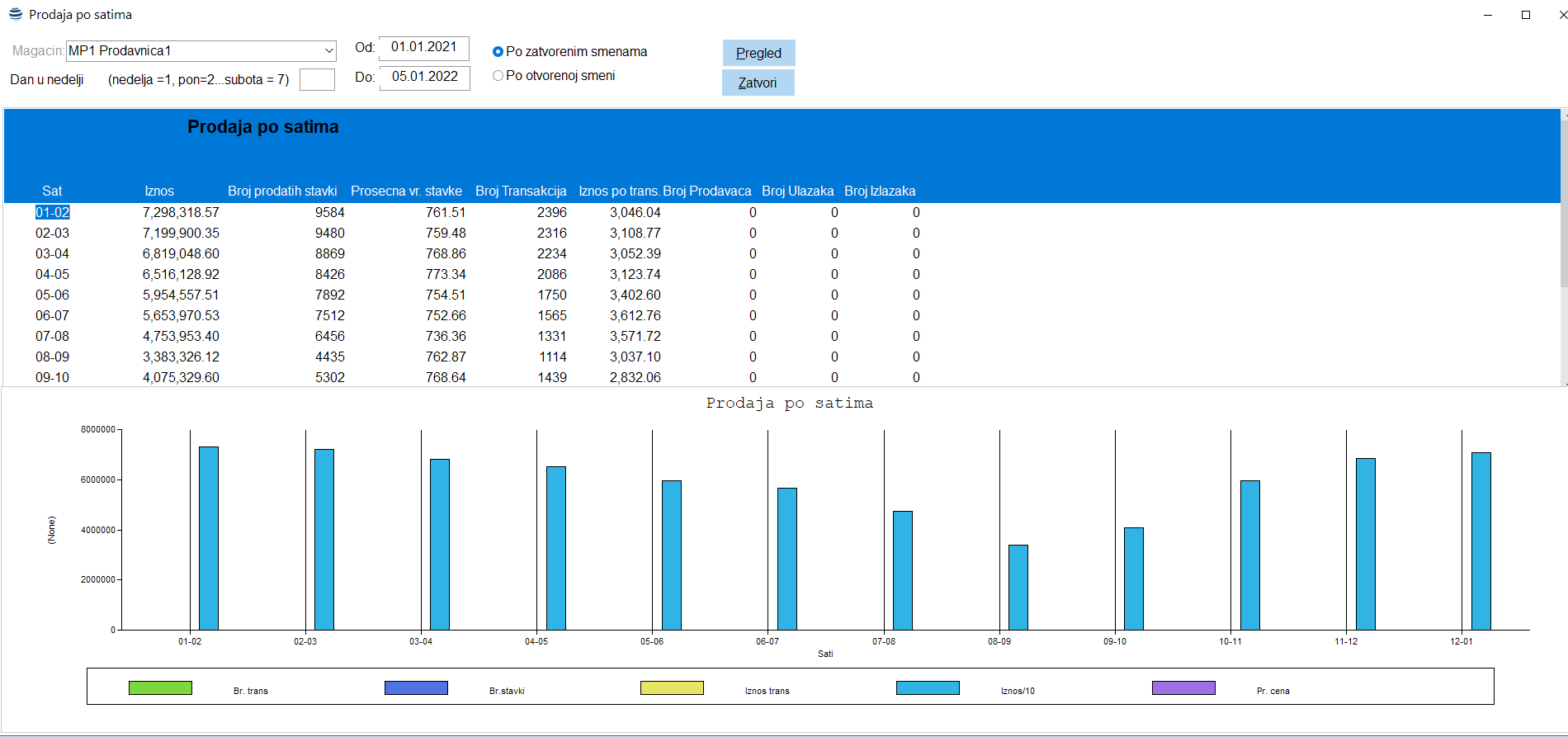 Prodaja po satima daje pregled prodaje po satima u toku dana. Ukoliko se gleda period veći od jednog dana, izveštaj daje trendove koji govore o opterećenosti prodavnice u toku dana. Takođe može se birati samo jedan dan u nedelji da bi se videlo npr. da li je nekim određenim danom u nedelji u određeno vreme veći pritisak u smislu broja klijenata. Ukoliko je sistem vezan za sistem za praćenje ulazaka i izlazaka iz radnje i to podaci se uključuju i sam izveštaj istoimenim kolonama.