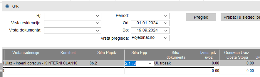 - Ukoliko EPP polje u ulaznim dokumentima ostane prazno. Program ce u KPR-u napraviti redove sa nulama. Potrebno je da polje EPP bude popunjeno, ako ne ide u evidenciju unesite bar prvu stavku iz padajuce liste 000 Ne ide u evidenciju. Takodje obratite paznju ako u dokumentu postoji vise stavki, svaka stavka mora imati popunjen epp.