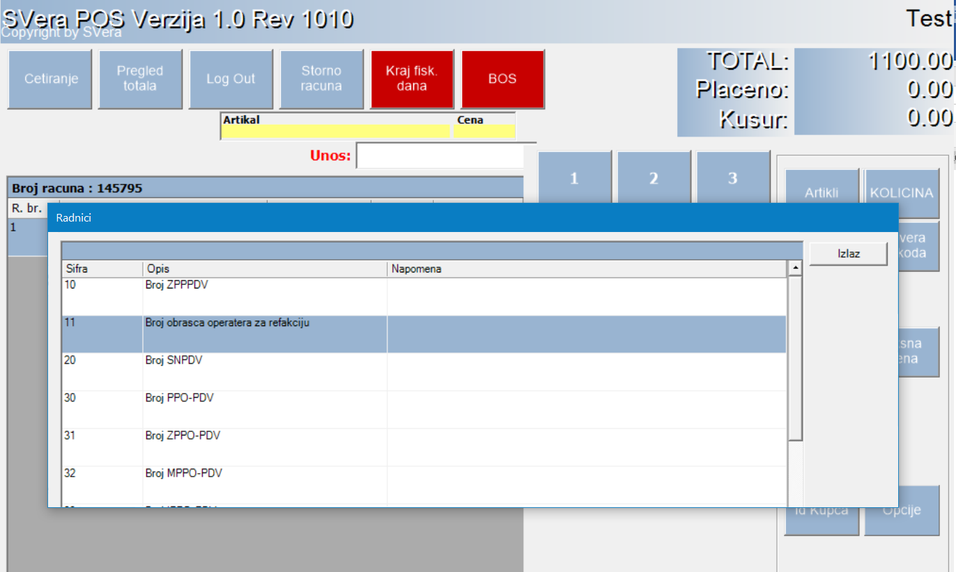 Kod aktiviranja opcije Opcije biramo opciju 11 Broj obrasca za refakciju. Nakon ovog koraka ostali koraci su identični postupku opisanim u prethodnim poglavljima sa izdavanjem računa sa identifikacijom kupca i opcijama.