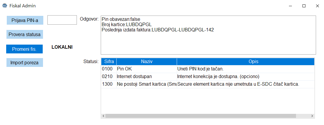 Klikom da dugme Provera Statusa sistem vraća trenutni status PFR-a i kroz niz poruka prikazuje koji je status. Na ovaj način korisnik može da ustanovi ako postoji problem koji element u sistemu izaziva taj problem (nije unet pin, čitač nije povezan, PFR nije dostupan, kartica nije u čitači itd.) i na taj način lakše da otkloni problem.