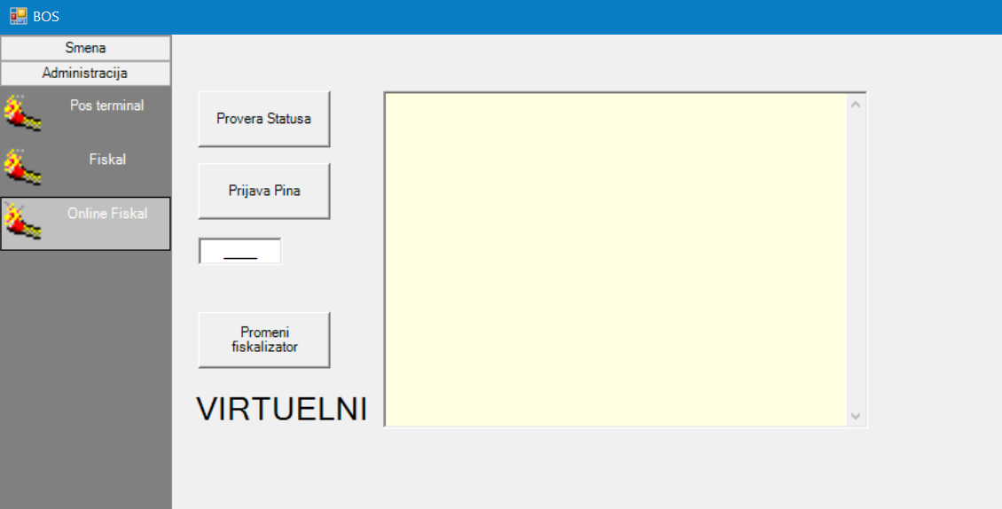 Ovaj prozor može da se aktivira na sledeći način: Klikom na dugme BOS pa odabirom opcija administracija i nakon toga odabir opcije Online fiskal