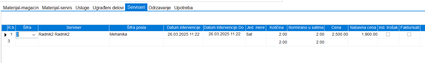 Fakturisati – Da li se određena kativnost servisera direktno fakturiše. Preporuka je ipak da se koristi tab Usluge u ovim situacijama